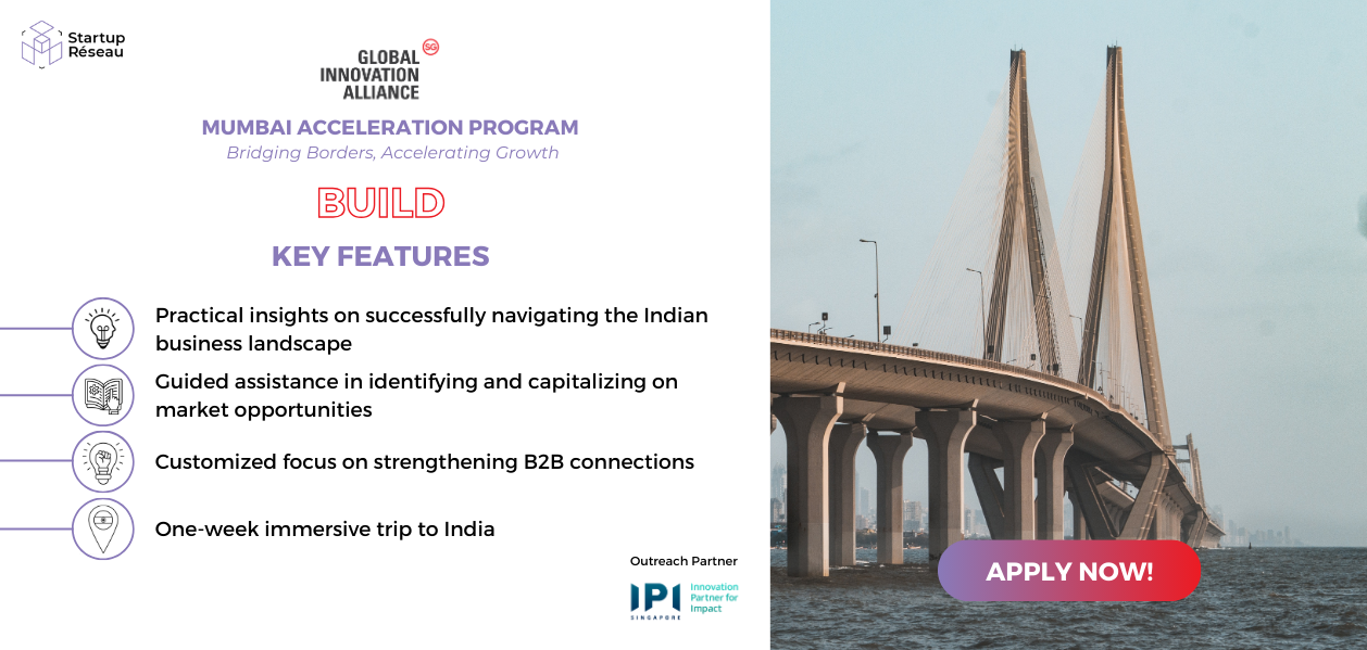 The Build-GIA Mumbai Acceleration Program is an intensive 6-week hybrid initiative tailored for Singapore-based tech companies to unlock the vast opportunities in the Indian market. The program kicks off on 6 May 2024, with applications closing on 7 April 2024.
