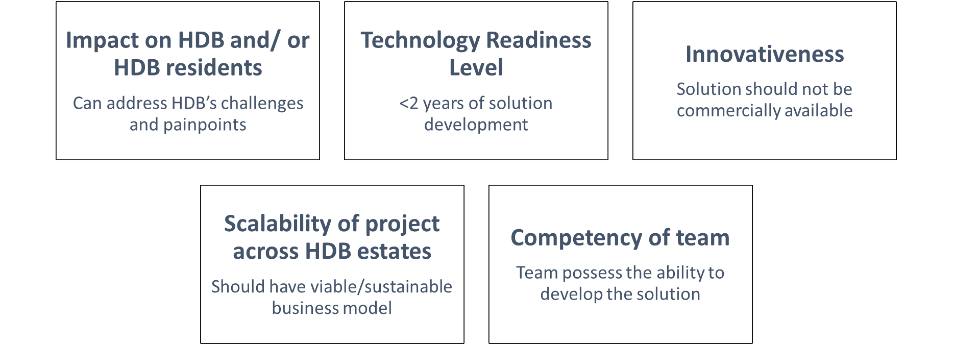 We are looking for solutions that can be developed and piloted in our Living Labs such as Punggol, Yuhua, Teck Ghee, and Tengah. Proposals will be evaluated based on the following criteria: