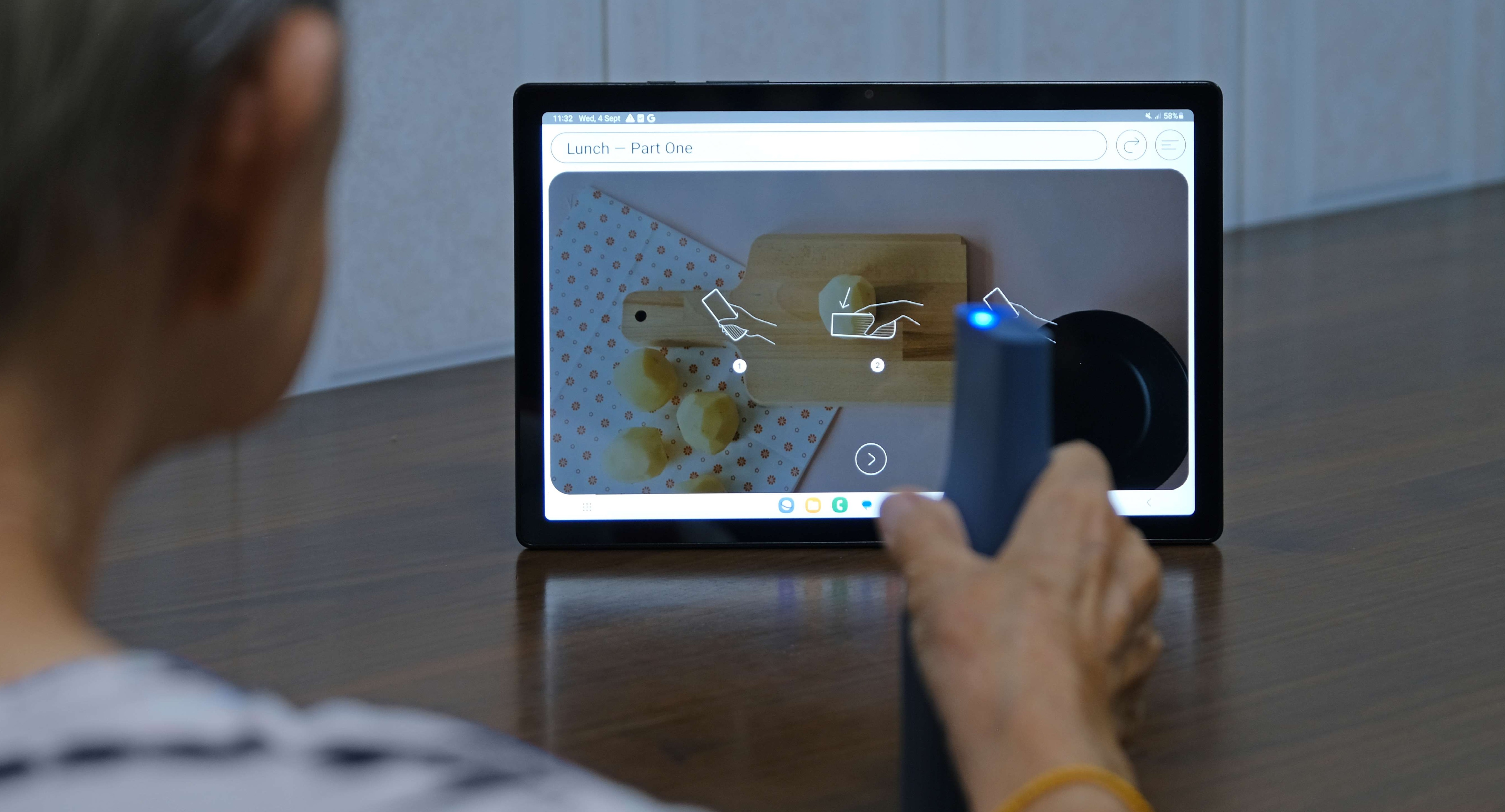 Handheld Motion-Tracking Tool: The device is equipped with a motion-tracking tool that detects and tracks gestures during therapy. Users interact with the tool by performing actions such as ironing or pounding peanuts.